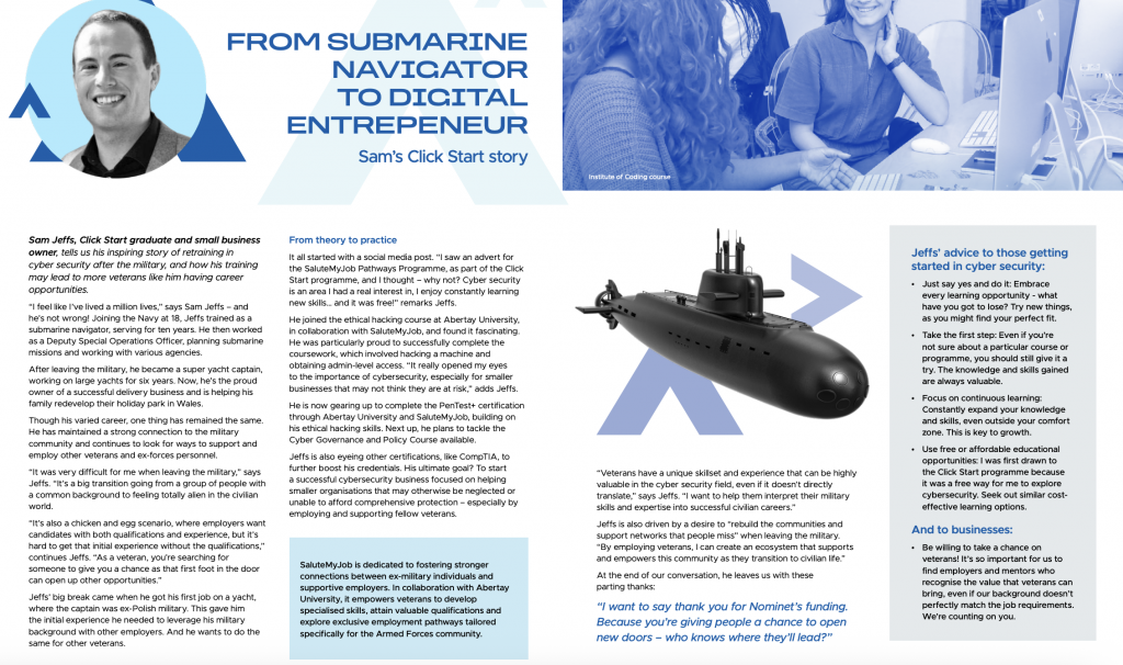 Now working towards advanced certifications and planning to launch a cyber security business focused on supporting smaller organisations, Sam is also committed to employing and mentoring fellow veterans. His goal is to build a supportive ecosystem that helps veterans translate military skills into civilian careers and rebuild the community connections many miss after service.